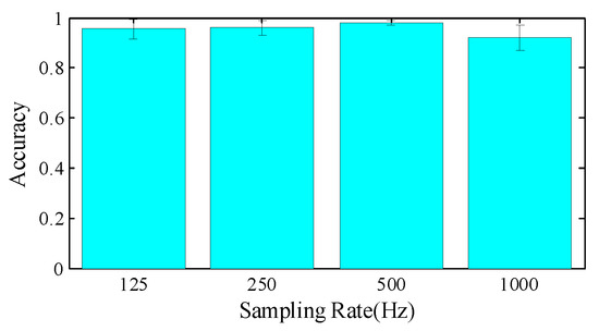 Impact of sampling rate. Please note that we extract image regions with a fixed size of 500 × 500; the high sampling rate introduces fine-grained local movement information, but limited global gesture features. To strike a balance, we first initialize the sampling rate at 1000 Hz and gradually discard CSI data to obtain sampling rates of 500 Hz, 250 Hz and 125 Hz. In Figure 15, we note that 500 Hz achieves the best performance, since it includes 1 s gesture information with sufficiently detailed features. A sampling rate of 1000 Hz or higher may lower the performance, because the image region contains less temporal or gestural contextual information.