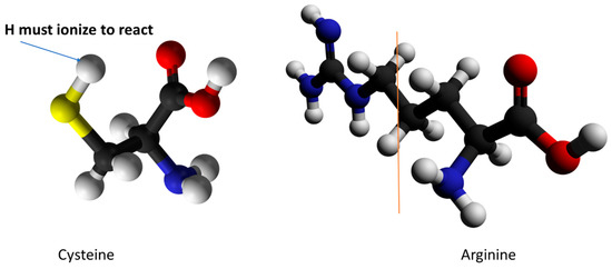 Comparison of cysteine and arginine: the section to the right of the vertical brown line on arginine approximates the volume that would accommodate a cysteine. If the hydrogen on the cysteine –SH ionizes, the cysteine becomes even smaller. The entire guanidinium group plus the proximate carbon take up space enough greater than the cysteine to be adequate for 2 to 3 water molecules. Beyond that line (to its left) on the arginine suggests the volume available for water or MTS reagent if arginine is replaced by cysteine.