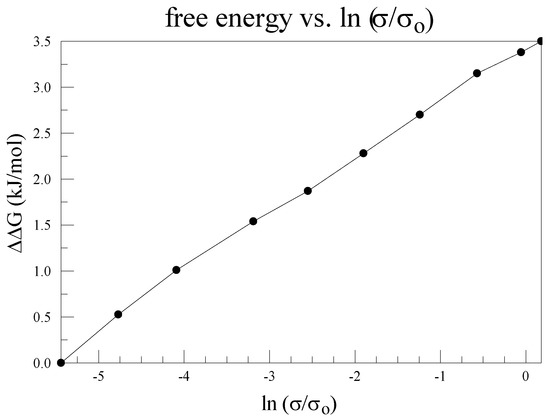 The dependence of the conductance of a KcsA channel on the concentration of K+ ion is similar to that of other K+ channels. It was measured by LeMasurier et al. [100]; the data from that paper have been replotted by Kariev and Green as Figure 3, using –RT log [K+] = ΔG [43]. This shows the conductivity is proportional to the free energy of the [K+] ion, which is consistent with the existence of a single barrier for conduction of the ion. The free energy is given relative to the low concentration, hence is shown as ΔΔG. The conductivity is σ, and is shown as relative conductance. This would be consistent with a barrier at the entrance to the pore, if the conductivity measures the effective concentration of the K+ in the pore, and the free energy is proportional, as just noted, to the ln[K+]. In considering the thermodynamics of the channel, this contribution must be included. The existence of a barrier at the pore for an incoming ion has implications for gating as well. If a gate becomes too wide open, such a barrier is hard to understand; if there is only a limited extent of motion at the gate, the existence of such a barrier is much easier to understand. Based on our mechanism we expect a small opening at the gate, which in turn requires the existence of a barrier.