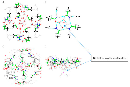 There is an experimental X-ray structure at a pentameric channel gate by Sauguet et al., in which water, associated with a Na+ ion at a channel gate, looks like a basket of five water molecules [123], plus a fairly tight second set of water molecules within the channel pore, above the ion. This turns out to be very similar to a basket of water molecules that we have calculated for a KcsA channel gate. In the Sauguet et al. study, the Na+ ion may be trapped at the channel gate by the water interacting with the protein. This appears to be closely analogous to a structure we have calculated for the gate of a KcsA channel. The water structure we have calculated is shown in Figure 4.