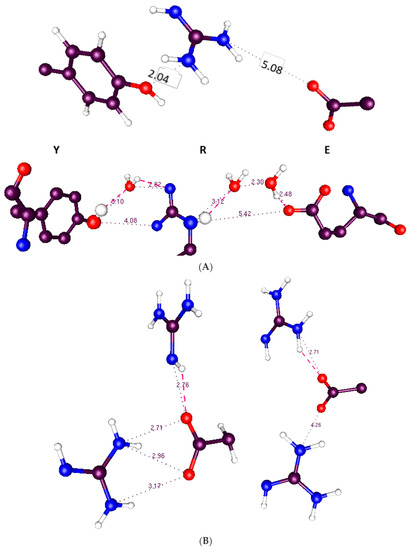 Proton transfer often involves water. We will show an example that does not involve water, but there are two unusual cases that may be relevant to our problem. First, it is possible to set up a system of guanidinium (thus, functionally arginine) plus a carboxylic acid, that incorporates two water molecules between the guanidinium and the acid, so as to form a ring. When the ring is complete, the energy drops sharply. On further study of the system, the behavior is most easily understandable as a resonance hybrid structure, as referred to briefly above [101]. The fact that there is a small resonance structure that could stabilize a more complex system suggests care must be taken in trying to understand a structure of protein that contains water. In a sense this is not a surprise; most proteins interact with water in one way or another.