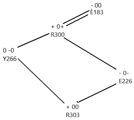 Two paths from R303 to R300, and then on to E183. The single lines represent one of the paths, the double lines mean both paths follow that step. The left symbol gives the nominal charge on that amino acid in the closed state, the right two symbols give the charge in one path each, with the left charges all for the same path, and the right charges all for the same path (e.g., E183–00 means E183 is negatively charged in the closed state, and neutral in both paths to the open state). Actual charges as calculated by NBO (Natural Bond Orbital) are fractional, but of the sign shown. The proton follows the charges as shown. In the closed state, the S176 –OH is oriented so as not to form a hydrogen bond with R303 in the closed state, and oriented to form such a bond in either path of the open state, thus altering the local field.