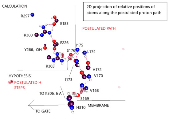 That water may be crucial is not a great surprise. Obviously, it interacts with ions. In addition, it is well known to be part of a system for transmitting protons, albeit most often in the form of a water wire. In addition, it is known that D2O makes a difference to gating, slowing it down, at least in Na+ channels [125,126,127]; it is reasonable to assume that in this respect Na+ and K+ channels are similar. This is also true for Hv1 channels [128]. The effect appears in the last step of gating in Na+ channels [129], which agrees with what we would require in this model. The proton transport chain begins in the VSD TM section, which senses the field. Starting from the closed configuration, it responds by sending a proton cascade in the extracellular direction, pulling protons from the gate region via a path that involves water along the intracellular surface. Thus, the first steps are in the transmembrane section, and the final steps involve the gate. The final steps being those affected by water in this model, it is consistent with the experimental D2O results. The idea that water could play a key role in gating was the first suggestion in our work [130], which considered the possibility of an electrorheological effect, in which the water became relatively rigid in the presence of a strong electric field. Whether an electrorheological effect exists at the gate is still to be determined. The field that polarizes the membrane almost certainly does not affect the intracellular water directly, but the motion of protons may change the field sufficiently at the intracellular surface that this water too responds to the field, albeit indirectly, as a consequence of the motion of protons; only protons and side chains move in direct response to the polarization/depolarization of the membrane. At this point it is possible to have a hypothesis as to the proton path from the section that has been calculated to the gate; calculations are in process to test whether this hypothesis is correct. This is described in more detail with Figure 7, below. The key point is that it is possible to find a complete explicit path between the calculated section and the gate. Alternate paths can be postulated, but all paths involve the T1 moiety which hangs on the intracellular side of the channel, and which is known to affect gating [23].