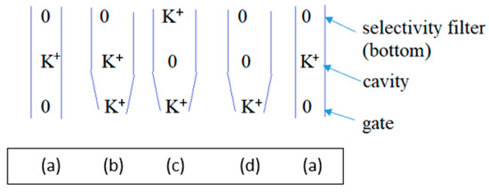 There is also a cavity in the pore, in which an ion is found in the X-ray structure. An incoming potassium ion would have to interact with such an ion, which could knock back an incoming ion that moved beyond the entrance to the pore toward the cavity, rather than the incoming ion knocking the cavity ion on into the selectivity filter. This ion has no particular force pushing it into the gate; there is a concentration dependence of the free energy of the ion in the external solution [100] (see Figure 3) that suggests a free energy gradient on K+ that might help somewhat, especially with getting the ion into the gate. We have done a limited calculation of the interaction potential that suggests that the water so substantially reduces the interaction energy between an ion at the gate and the cavity ion that, as long as the ion at the gate stays at the gate, the repulsion energy is almost zero. However, the ion then cannot advance, or displace the water or the ion in the cavity. Therefore, we proposed that the gate would have to oscillate, complexing and holding the incoming ion, which then cannot be knocked back, so that the ion in the cavity would proceed to the bottom state of the selectivity filter, given sufficient time, once the bottom state of the selectivity filter becomes available. Once the cavity cleared, the ion at the gate could move into the cavity, not so much having pushed the previous ion forward, as having simply allowed it to move, and then replaced it. The cycle is indicated in Figure 8, reproduced from [43]. This implies that the gate can complex K+ well enough to force the ion in the cavity to move up, or at least allow it to move up. The complex must not be so tight that, once the cavity becomes available, it cannot release the K+; the cavity location is then of lower energy than the solution, so that the ion moves into the cavity rather than back to solution, and the current continues. Here it is interesting to compare the KcsA closed structure to the Kv1.2 open structure, for both of which X-ray structures exist. Kariev and Green noted that the gate opening was about a 3 Å increase in the radius of the intracellular gate [43].