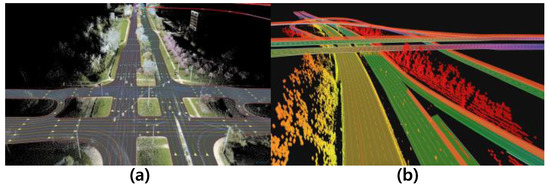 There were many previous studies to use the HD map for the autonomous driving. A route network definition file (RNDF) was used as the HD map in the DARPA challenges to provide the routes to autonomous cars [9]. Google self-driving cars used the 3D high-accurate HD map [10]. The demonstration in Bertha Benz Memorial Route by the Daimler utilized a Lanelets that is an efficient data structure for the drivable environment map as the HD map [11]. Not only these studies, there have been many autonomous car tests based on the HD map [12,13,14,15,16,17,18,19]. These previous studies are evidence that the HD map is a critical factor in the future industry of autonomous. A technical report [20] also forecasts that the HD map is one of the key technical components of the autonomous car era. Therefore, many mapping companies, such as HERE [21] and TomTom [22], are preparing or starting to provide the HD map for the era of autonomous cars. HERE provides a HD map that contains various semantic features, such as road geometry, lane boundaries, barriers, traffic signs, and traffic lights, in 10-to-20 cm accuracy, as shown in Figure 1a. TomTom also provides semantic features similar to HERE and provides depth information for static objects via Road DNA [23], as shown in Figure 1b.