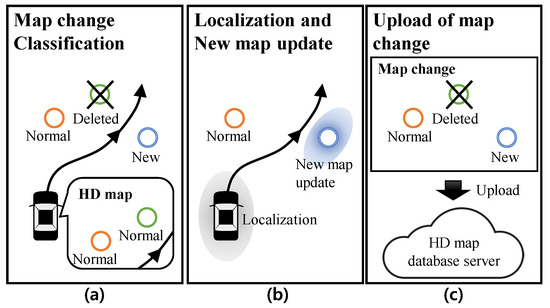 Process of the map change update. The first step is map change classification, the second step is the utilization the HD map and the updating the new map features, and final step is the upload to HD map database server.