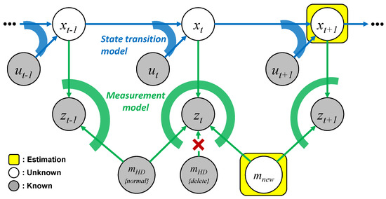 A directed graph of a DBN based on the Markov process assumption can represent the various types of localization and mapping problems using the probabilistic framework. The DBN is composed of nodes for probabilistic random variables and directed edges for representing conditional dependencies between two nodes. The nodes of the localization and mapping problems consist of the , , , and . The indicates a sequence of the vehicle pose from discrete time steps 1 to t. The represents the vehicle motion input, and the represents the observation of the map features by perception sensors. The indicates the position of map features that can be observed by the perception of autonomous cars. The edges that represent probabilistic constraints between the nodes consists of a and for the localization and mapping problems. The represents a motion constraint between the two adjacent vehicle state and regarding the motion control input . The state transition model can predict the future vehicle state using the previous state and input . The describes the probability of measurement given the state with the map m. The measurement model can estimate the probability distribution of the measurement based on the current state and map features m.