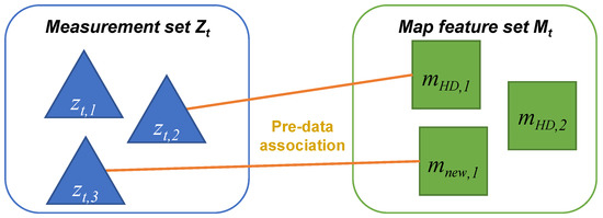 The first step is pre-data association between the measurement set and the map feature set located in the sensor FoV, as shown in Figure 6. In the pre-data association, each measurement is associated with each map feature by maximizing the likelihood of the measurement with a certain likelihood threshold.