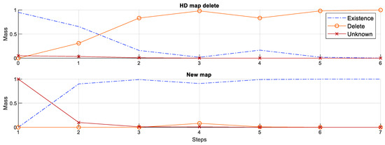 The changes of the map features are classified based on its existence. The existence could be evaluated by the mass functions of the power set based on the DS theory. Figure 8 shows the mass functions of each existence state according to the sequence of the measurement input for cases of the deletion of HD map feature (upper figure) and the creation of new map feature (lower figure). To determine the deletion of HD map feature, the existence mass functions of the HD map feature was initialized with the (3) and updated based on the Dempster combination rule (5) with the non-measurement existence (2). The existence confidence of the traffic sign detection was 0.9 and the existence confidence of HD map feature was 0.95. For the creation of new map feature, the existence mass functions of the new map feature were initialized from the position of the measurement with the (4) and updated based on the combination rule (5) with the measurement existence (1). Although there were outliers for step 4 of the both process, it did not affect the final classification of the map changes.
