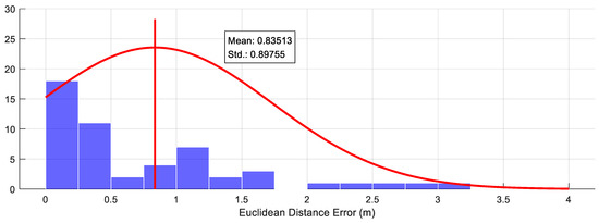 The evaluation of position error for the traffic signs classified into the new map feature is shown in Figure 8. The reference position of the new map features for the evaluation obtained by the GraphSLAM based post-processing with real-time Kinematics RTK-GPS. An average of the position error was about 0.8 m and the standard deviation was about 0.9 m, as shown in Figure 9. The position error was caused by the uncertainty of the traffic sign detector using the camera vision. Although there was about one-meter error for the new feature estimation, it is enough to report the location of the map feature change to the map provider and use it as a temporary map feature until the precise ground mapping is performed.