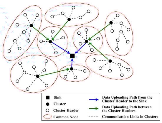 In [20], the size of clusters located around the sink is smaller than those far away from the sink, as shown in Figure 1. In this case, the cluster heads near the sink consume less energy while collecting data from their direct children, so they have enough energy to forward data uploaded from other clusters. Although this type of network structure efficiently balances the energy consumption of the whole network and alleviates the energy hole problem near the sink, the workload between the CHs and common nodes is still unbalanced. Moreover, the unsuitable location of the cluster header may also increase the energy consumption for communication between this CH and its members. Liu et al. regarded that inter-cluster energy consumption is more than intra-cluster energy consumption in a large-scale WSN [16]. Therefore, they designed EBCAG to achieve energy balance among CHs and to decrease the total energy consumption of nodes. Each node has a gradient value which determines the optimal radius of the cluster as well as the routing strategy for CHs. Nevertheless, the energy consumption for calculating the optimal radius is still higher, which decreases the energy efficiency of the whole network.