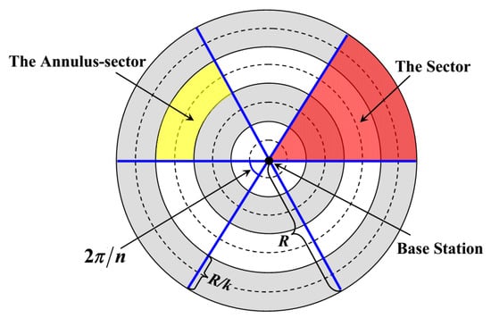 Similar to [17,30], the network is regarded as a circular region with a radius R and divided into k virtual concentric annuli with the same width. Meanwhile, this circular network is also divided into n sectors of the same size. That is to say, the network is composed of nk annular sectors. For example, to illustrate the model more clearly, we divide the network into four virtual concentric annuli, as shown in Figure 3. In addition, this network also consists of six sectors (the red area). Thus, there are 24 annulus-sectors (the yellow area) in the network. It is not difficult to know that, the number of these annulus-sectors will increase with the expansion of network scale, which enhances the flexibility of our model.
