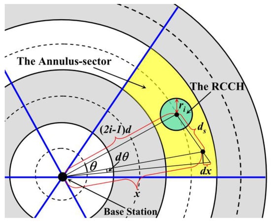 For the j-th annulus-sector of the i-th annulus, it is easy to know that the distance from the center of its RCCH to the base station (BS) is (2i − 1)R/2k, as shown in Figure 4. x and ds are defined as the Euclidean distances from any one node in this annulus-sector to BS or to the center of the RCCH, respectively. It is assumed that during a round of data collection, the amount of data collected by one node is l bit. Therefore, according to [37], the total energy consumption of the non-cluster heads in one annulus-sector (denoted as Eij) during a round of data gathering time is