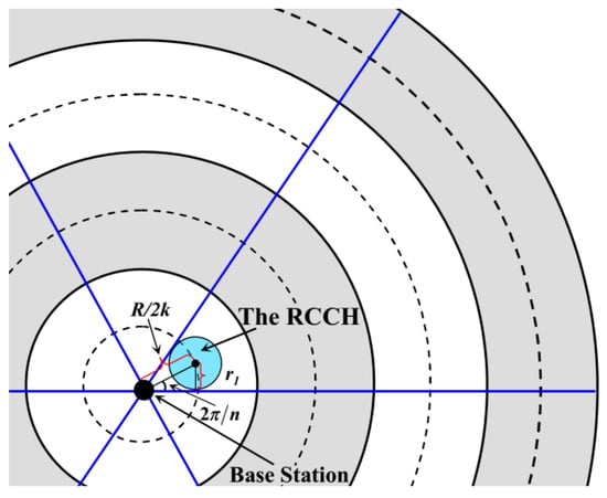 On the other hand, the range of the RCCH should not go beyond the boundary of the annulus-sector at which it is located. There is no doubt that the area of the annulus-sector in the first annulus is the smallest, and according to Equations (15) and (17), it is also known that the area of the RCCH in this annulus is the largest. Thus, we only care about the upper limit of r1. As shown in Figure 5, if and only if the boundaries of the RCCH and the annulus-sector are tangent, the value of r1 is the maximum, so it needs to meet the following expression: