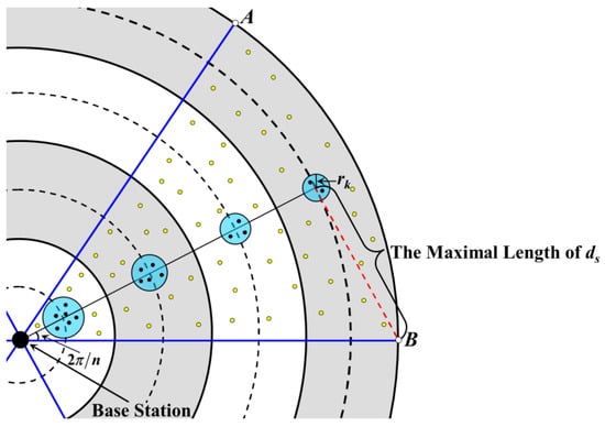 Like in Section 4.2, the Euclidean distance from any node in the k-th annulus to the center of its RCCH is defined as ds. As shown in Figure 6, the value of ds is maximal if and only if this node is located at point A or B. In this case, the maximum value is: