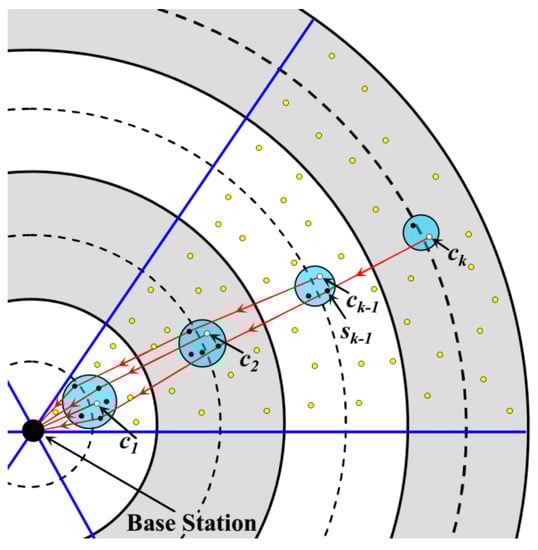 However, if ck sends the C′ bits of data directly to ck−1 (the CH in the (k − 1)-th annulus) at this time, the buffer of ck−1 will overflow as l × Nk−1 bit of data has been stored. However, the buffer of each CCH in the RCCH where ck−1 is located at is empty right now. Thus, the CCH with the highest residual energy is selected as the next-hop receiver of ck. That is to say, in each RCCH of the (k − 1)-th annulus, there are two nodes responsible for data uploading. One is the CH (i.e., ck−1 in Figure 7, and another one is the CCH (i.e., node sk−1 in Figure 7. Similarly, in each RCCH, one CCH should be selected to receive and forward the data uploaded by the CH in the adjacent outer annulus. Therefore, for the RCCH in the i-th annulus, there are k − i + 1 nodes (one CH and k − i CCHs) need to send data to the corresponding nodes in the (i − 1)-th annulus, as shown in Figure 7. The specific steps of the data forwarding strategy are described as follows: