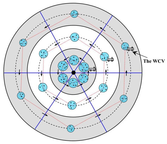 According to Equation (43), it is easy to see that during the first round of recharging, the amount of energy recharging for each RCCH increases with the increase of j. Thus, the value of tijc is also increasing. However, the value of Tir is always unchanged, so the moving speed of WCV on different segments should be increased one by one. Moreover, the moving path length of WCV is equal between any two adjacent RCCHs in the same annulus. Thus, in Figure 9a, the length of tijm decreases with the increase of j in the first round of recharging.
