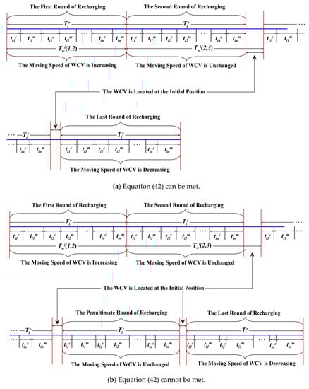 In addition, it can be seen from Equation (37) that from the second round of to the penultimate round of recharging, the amount of energy recharging for each RCCH is equal to each other in the same round. Therefore, the value of vWCV on different segments should be the same in this case, and the length of tijm shown in Figure 9a is unchanged after the first round of recharging.