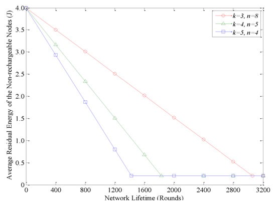 As mentioned above, in AEBDC, the WCV periodically recharges nodes located in the RCCH to ensure their sustainable operation. Compared with other non-rechargeable nodes, those nodes in the outermost annuli have the highest energy consumption rate due to their long single-hop transmission distance. For this reason, we focus on the average residual energy of those nodes, and the result is shown in Figure 11. When k = 3 and n = 8, the performance of this experiment is the best, and the dead nodes only appear after about 3000 rounds. However, in the case of k = 4, n = 5 or k = 5, n = 4, the dead nodes appear after 1800 or 1400 rounds, respectively.
