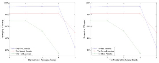 It can also be found from Figure 12 that the closer the WCV is to the center of the network, the higher recharging efficiency it has, regardless of the network partition modes. In this case, the moving path of the WCV is shorter than those of the other annuluses, so the energy consumption on moving is lower. Furthermore, the RCCHs that close to the center of the network consume more energy, so the amount of energy recharged for nodes is also slightly higher. It can also be found in this figure that, the recharging efficiency of the last two rounds decreases greatly. As mentioned before, in AEBDC, the moment when the first dead node appears in the outermost annulus is regarded as the end of the network lifetime. Therefore, in order to avoid energy waste, all nodes are do not need to be fully recharged in the last one or two rounds. The detailed recharging strategy has been described in Section 5.4.