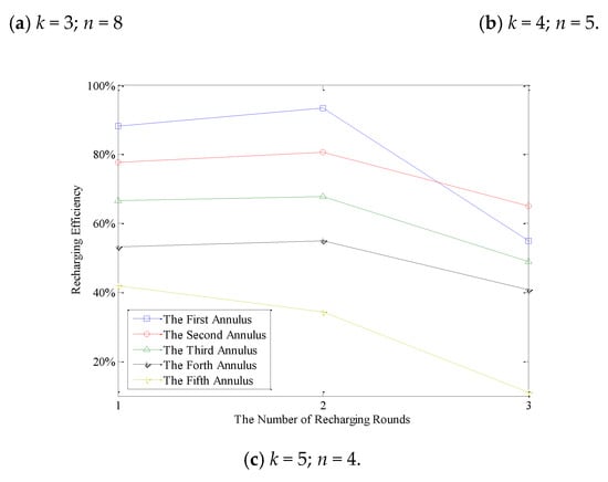 In AEBDC, the “recharging efficiency” is defined as the ratio between the total amount of energy recharged for nodes in a round of recharging and the battery capacity of WCV. From Figure 12, it is not difficult to see that no matter what the value of n and k is, the recharging efficiency of WCV in each annulus is relatively high except for the last one or two rounds. For example, in the case of k = 3 and n = 8, the recharging efficiency of WCV in the innermost annulus is still higher than 90% during the first three recharging cycles. In this case, the energy consumption rates of nodes in each RCCH are basically stable, so the most appropriate recharging request thresholds of them can be accurately calculated out by Equations (31)–(34). Furthermore, according to Equations (37), (39) and (40), the total amount of energy recharged for nodes in each RCCH during a round of recharging can also be calculated. Therefore, the energy that the WCV carries before each recharging is made full use of.
