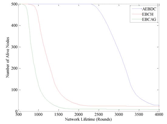 In this subsection, we compare our method with EBCAG and EBCH. In AEBDC, the network is divided into several virtual concentric annuluses with the same width, which is the same as EBCAG and EBCH. The nodes are organized into uneven clusters in these three methods for balance of energy consumption.