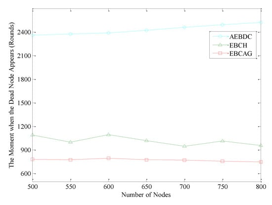 The time when the first node dies is shown in Figure 14. It is easy to see that in EBCAG, no matter how many nodes are deployed in the network, the moment when the first dead node appears is almost unchanged (at about the 800-th round). The reason is that the optimal radius of the cluster is calculated which minimizes the energy consumption of the whole network. When the total number of nodes increases, the length of radius of each cluster decreases accordingly to maintain the number of nodes within the cluster unchanged essentially. Therefore, the energy consumption of the CHs in EBCAG does not change too much. For EBCH, when the first node dies, the number of data gathering cycles fluctuates to a certain extent with the increase of the number of nodes, and it appears to decrease slightly as a whole. The reason for this tendency is that the number of nodes in each cluster will increase when there are more and more nodes in the network, which enhances the workload of CH. Thus, as the energy consumption of CH increases, the moment when the first dead node appears is ahead of time. That is to say, EBCH is not suitable for the densely deployed network. In AEBDC, although the network load becomes heavier and heavier with the increase of the total number of nodes, the number of nodes in the RCCH increases accordingly. This ensures that more nodes can participate in competing for becoming the cluster header. This effectively balances the energy consumption of each RCCH. Therefore, in AEBDC, the time when the first dead node appears is postponed as the number of nodes increases. In other words, the data collection method proposed in this paper can be applied to various types of networks.