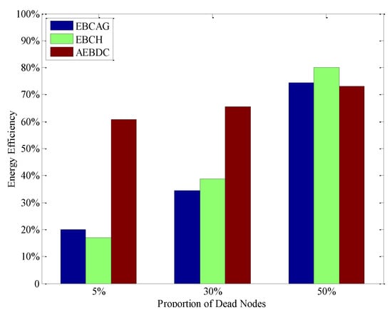It is worth mentioning that, in AEBDC, there are a few WCVs in the network to periodically recharge the nodes in each RCCH, and the actual available energy of nodes in AEBDC is greater than that in EBCAG and EBCH. Thus, the “energy efficiency” of the three methods are further analyzed, as shown in Figure 15.