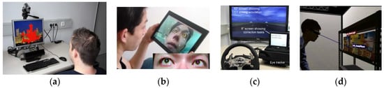 Eye gaze applications in various consumer platforms (from left: (a) desktop [2], (b) tablet [3], (c) automotive [4], (d) head-mounted [5] eye tracking setups).