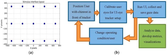 (a) Shows the layout of the stimulus interface (UI) with AOIs (circles) where a user has to look during data collection. (b) Shows the experiment flowchart for data collection.