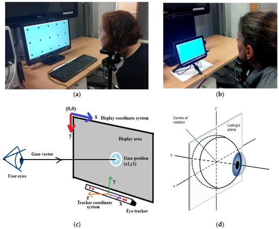 The figure on top left (a) shows the eye tracker under test mounted on a desktop computer display along with a participant seated in front of it (desktop screen shows the AOI layout in static form). (b) Shows a tablet mounted with the eye tracker using the same UI and experimental workflow as that used for the desktop. (c) Shows the display and eye tracker coordinate systems for this work and (d) shows the eye movement coordinate systems with Listing’s plane and Fick’s axes.