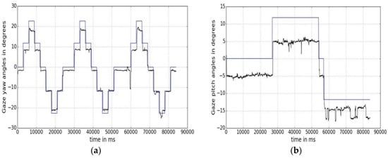 Using Equations (9) and (10), the gaze yaw and pitch angle values along with ground truth yaw and pitch values for one user gaze data during one experimental session are plotted against time in Figure 4a,b, respectively. In Figure 4a, the blue line represents the ground truth yaw angles, as calculated from Equation (10). Each step in the curve represents a different AOI position on the screen. The black line shows the variation of a user’s gaze yaw angle with time as estimated by Equation (9). In Figure 4b, ground truth AOI pitch angles are shown in blue and estimated gaze pitch angles in black.