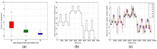 A box plot is a valuable method to compare several error statistical attributes from multiple experimental datasets [44]. A box plot of the data from the three user distance experiments (45, 60, 75 cm) is shown in Figure 5a. It presents the statistical result summary, i.e., minimum, first quartile, median, third quartile, and maximum error values for the UD45, UD60 and UD75 experiments in a single figure. In each box the minimum and maximum data values represent the endpoints of the vertical line and height of the box shows interquartile range. A small interquartile range indicates that data is centered while a larger range means that the data is more scattered. The result of using box plot on UD45 and UD75 data indicates that UD45 dataset is more scattered in nature than UD75 data, and the error magnitudes are also higher. Another statistical metric, called Z scores analysis is done on UD45 gaze data to estimate the level of scatter in data points at different AOI positions and is shown in Figure 5c, which helps to reveal person-to-person variation of gaze data properties.