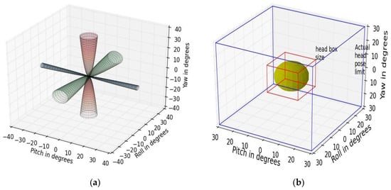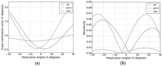 where Sr, Sp and Sy are the sensitivities with respect to head pose roll, pitch and yaw angles respectively. Hr, Hp and Hy are the head pose angles in roll, pitch and yaw directions and Er, Ep and Ey are the corresponding gaze estimation errors (in degrees). The plot of gaze error vs. head pose angles is shown in Figure 6a and the head-pose sensitivity plots for head pose changes in roll, pitch and yaw directions are shown in Figure 6b.