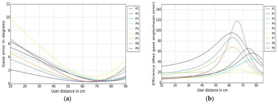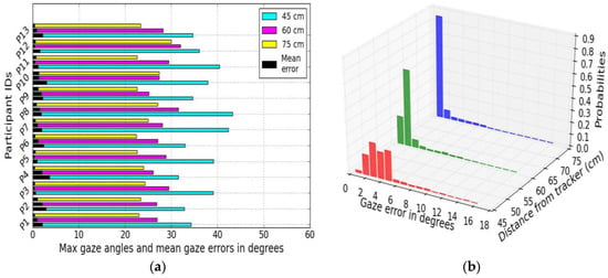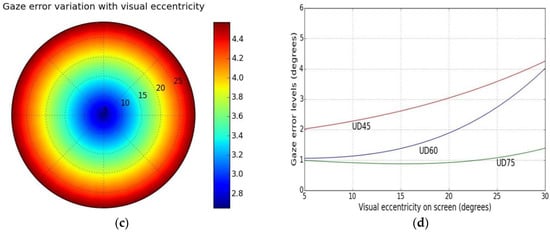Examples of statistical analysis on gaze data are shown in Table 3 and Figure 5a–c. Data collected from user distances experiments (for 45 and 75 cm) are used for analysis. Implementing the metrics on gaze data reveals some important characteristics of the eye tracker under the impact of variable user distance conditions. It is seen that maximum gaze angle and mean gaze errors are higher when users are closer to the tracker (at 45 cm) than when they are further away (75 cm). Also, the confidence intervals are lower in UD75 than in UD45 experimental data, which means that error variability is more at lower user-tracker distances. Use of statistical metrics may therefore help to know how to get optimal good accuracy and better consistency of results from any given tracker.