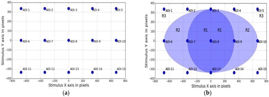 Eye tracking experiments are performed on desktop and tablet platforms for gaze data collection. The setup details are provided in Table 2 and comprises of a remote eye-tracker mounted on the screen of a desktop or a tablet device, which display a visual stimulus interface (UI). In the UI, a moving dot sequentially traces a grid of (5 × 3) locations over the display screen as shown in Figure 2a (it shows the static view of the screen locations traced by the dot). The UI dot radius is 10 pixels and it stops at each location for 3 s before moving on to the next. The angular extent of the UI stimulus grid is 30 degrees of visual angle at 45 cm distance. The UI is synchronized with the eye tracker to collect gaze data during an experimental session. The locations traced by the dot are henceforth called areas of interest or AOIs whose on-screen positions are known in pixel coordinates. The collected data comprises of a participant’s gaze coordinates on the display and corresponding time stamps as estimated by the tracker, while AOI locations form the ground truth. All data are stored in comma separated values (CSV) files.