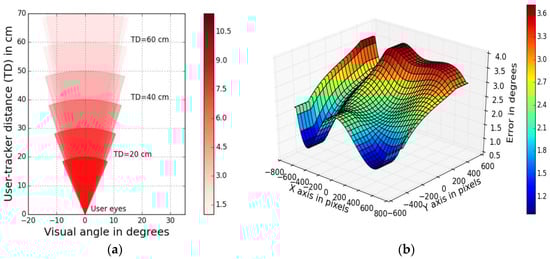 Using these equations and data from our experiments, the mean angular accuracy of the eye tracker used in this work is found to be between 3 to 5 degrees for a user tracker distance of 45 cm, 2 degrees for a distance of 60 cm and 0.9 to 2 degrees for 75 cm respectively. The results from the above calculations are also used to estimate gaze error throughout this paper to compute other gaze data metrics and implement visualizations.