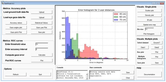 A snapshot of the graphical user interface GazeVisual v1.1 which is currently being developed for implementing the accuracy metrics and visualization concepts as discussed in Section 4 and Section 5 above. A sample histogram plot using data from UD45, UD60 and UD75 experiments is displayed in the plot area of the GUI. Other visualizations are also to be shown in this area and the plots can be saved. A demo video of the software demonstrating a set of its functionalities may be found in the GitHub link: https://github.com/anuradhakar49/GazeVisual/tree/Demo-videos.