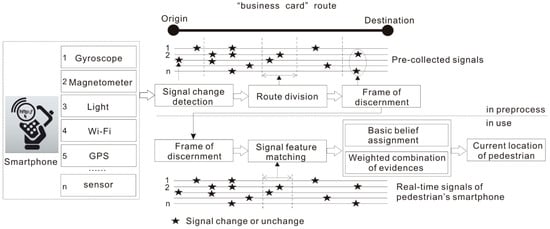 Figure 1 illustrates the framework of the proposed approach. This approach requires the initial collection of all signals of smartphone’s sensors along the whole business card route. These precollected signals are used to build up the frame of discernment in the theory of evidence by applying two important steps. The first step is to detect signal change characteristics, including significant changes and unchanged patterns. The second step is to divide the routes into route segments according to the changes of the signals. The combination of signal changes forms the frame of discernment, which provides fundamental evidence to the process of signal feature matching while pedestrians navigate, dependent only on their smartphones. When a pedestrian follows the predefined business card route, they need to check their locations with the help of a navigation app on their smartphones. This app will compare the real-time signal of the smartphones with the frame of discernment by evidence checking according to the combination rule of evidence for each route segment. The determination is closely dependent on the basic (belief) probability assignment (BPA) [63] and the proposed weighted combination of evidence in the theory of evidence.