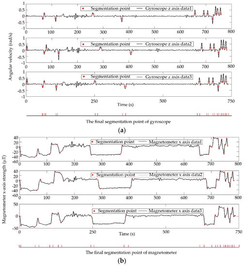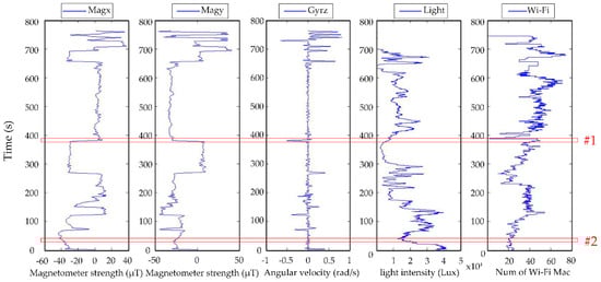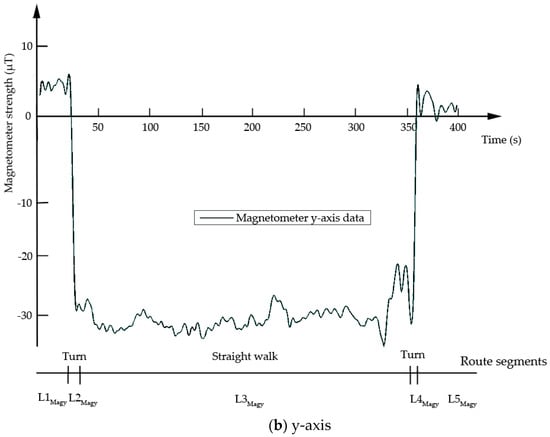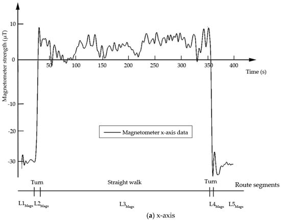 The first kind of sensor is a magnetometer, which is an instrument that measures the direction and strength of a magnetic field at a particular location. For a fixed point, the geomagnetic field can be decomposed into two horizontal components and a component that is perpendicular to the ground . The vector sum of the two horizontal components points to magnetic north, so the geomagnetism in the current environment can be identified only using the magnetometer x- and y-component data. In some locations, magnetometer readings are stable, but the magnetic values change when the environment is changing. Specifically, it may exhibit a sudden increase or decrease in value, and the variation in change quantity can reach 20 μT or more. The character of both the changes and lack thereof in the environment can be used as evidence of discernment. For example, Figure 2 illustrates two turns and the associated significant changes in magnetometer data. Consequently, this route can be divided into five segments based on the change features exhibited by the magnetometer, which indicate turns along the route. Based on the above division, this study could generate route segment sets and according to the x- and y-component data of magnetometer individually. The route segment set in Figure 2a, and in Figure 2b.