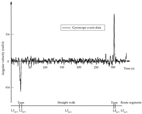 The second kind of sensor is the gyroscope. This sensor is able to detect the angular velocity of a moving object, which allows the recognition of turning. In the process of turning, the absolute value of angular velocity obtained by the gyroscope will increase significantly. However, in the situation of smooth walking, the z-axis value of the gyroscope is nearly zero. The positions of left and right turns correspond to the peaks and troughs of the gyroscope data, respectively, as shown in Figure 3. Any simple moving window algorithm can detect the peaks and troughs in the data. The found peaks and troughs can be used to divide the target route into segments for constructing the evidence framework, such as the route segment set in Figure 3.