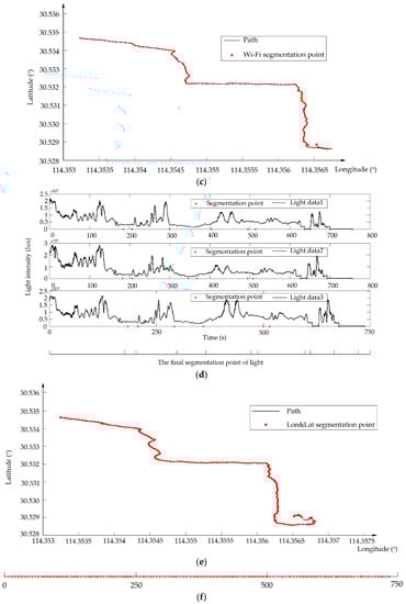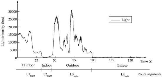 The third kind of sensor is the light meter. Figure 4 illustrates an example of light intensity data within variable and stable environments, which can be distinguished by the first differential of light intensities, and indicates the divided segments by light intensity. Five thresholds were trialed as the first difference in light intensities. The experiment showed that a threshold of resulted in segmentation that was close to reality. Each segment had a unique light characteristic, either of fluctuation or stability. The route segment set in Figure 4.