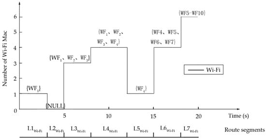 The other sensors are for Wi-Fi and GPS and the processes associated with them are very similar. The Wi-Fi signal distribution has a certain range, and the mobile phone can accept that signal anywhere within that range. Therefore, Wi-Fi Media Access Control (MAC) address along the target route could be used to divide it into segments. Each segment has a limited Wi-Fi MAC address set and the neighbor segments will have a different Wi-Fi MAC address. For example, the route segment set in Figure 5. Similarly, the route can be divided into segments according to the change of the latitude and longitude of GPS data along the segments. The route segment set in Figure 6.