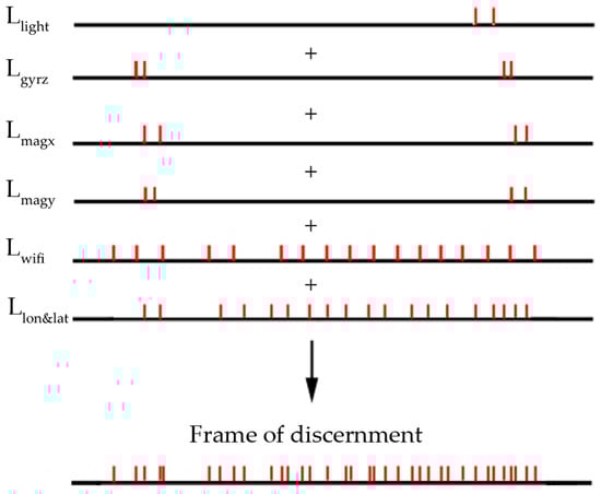 Before establishing the frame of discernment, the user conducts several complete walks along the target business card route, and collects the sensor data of the smartphone on this route using any sensor data acquisition application. For each sensor, this study divides the route into segments according to the changes in its data. Consequently, this study could obtain the route segment set for each kind of sensor, namely, , , , , , and , which are used to establish the evidence framework based on divided route segments. Each route segment must have at least one sensor change feature. The combination of change features within a route segment build up the evidence framework for each route segment.