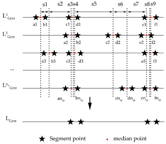 The determination of the above mentioned evidence framework is based on single data source. To a certain extent, the framework would bring about incorrect segment results due to external interference. For example, when encountering a temporarily parked vehicle in the process of targeting road, the record of magnetometer would fluctuate and generate redundant segment points. In addition, when data collector changes direction in order to avoid pedestrian, the record of gyroscope reaches peak or valley, which also affects the correctness of the framework. In order to eliminate above mentioned interferences, this paper optimizes the framework by using multiple repeated data sources. In this paper, each sensor data were collected times. They were divided as according to the above method. Then, this paper found the common segmentations of framework was the optimized framework of sensors. Figure 8 illustrates all frameworks of gyroscope. is the framework segmentation result of gyroscope in the collection of the times, and is the distance between two adjacent median points of a given segment route. Since the given GPS accuracy is about 15 m, if the distance between two points is less than 15 m, the two points are considered as a same position. Hence, this paper uses 15 m as the threshold to remove segment points whose median points are far from other median points. Moreover, the characteristic of the segmented section between each two deleted segment points is assigned as same as their previous section. For example, the characteristic of the deleted section is a straight walk, which is identical with the one of the sections . After this common segmentation finding, this paper could get a suitable framework for possible pedestrian navigation situations.