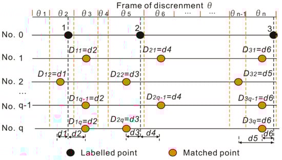 where is the location of labelled point in , and represent the start and end locations of . For example, in Figure 10, the calculated distances between the matched points and labelled point 1 are D11, D11, D1q-1, D1q. Here, = [(D11 + D11 + …… + D1q-1 + D1q) + (D21 + D21 + …… + D2q-1 + D2q) + (D31 + D31 + …… + D3q-1 + D3q)]/3q in the case of sensor i.