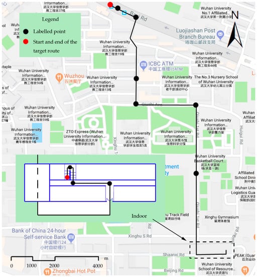 To estimate the performance of the proposed approach in terms of match success rate and positioning error of results, this study selected nine (black) labelled points along the target route shown in Figure 11 and recorded the actual locations of them manually when collecting the sensor data.