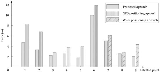 Figure 13 illustrates the average positioning errors of all nine labelled points obtained by the proposed approach, GPS and Wi-Fi. Among them, the positioning accuracy at the turning position is better than other positions, which may be because sensors, such as gyroscopes and magnetometers, have obvious characteristics when turning. Furthermore, the synthesized results of the proposed approach are obviously better than those derived from GPS or Wi-Fi alone. However, there is a large positioning error for point #6, probably because the path along point #6 is severely blocked by trees, and the weight of GPS is higher than other sensor in the outdoor environment. Furthermore, the intersection area around point #6 is large, and the gyroscopes and magnetometers do not have obvious changing characteristics. This indicates the need to reduce positioning error through the use of more sensitive evidence.
