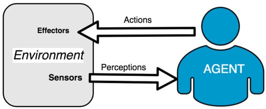 Smart software agents are a series of entities that seek to emulate human reasoning processes or behaviors. It is possible to find agents focused on helping users, performing certain tasks, performing supervisory and security tasks, or filtering information, among others. Based on these definitions, Figure 2 shows the basic diagram of the relationship between an agent and the environment in which it is deployed. It is possible to observe how the agent perceives its environment through a series of sensors and subsequently intervenes in it through effectors.