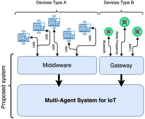 This system is integrated into a multi-agent architecture that will be responsible for managing the different wireless devices that make up the IoT scenario in which the system is deployed. Two main types of wireless devices that can be deployed have been identified: Wireless devices capable of exchanging information with the Internet and devices that require a gateway that acts as a link between the device and the Internet. These two types of devices have been called type A devices and type B devices, respectively.